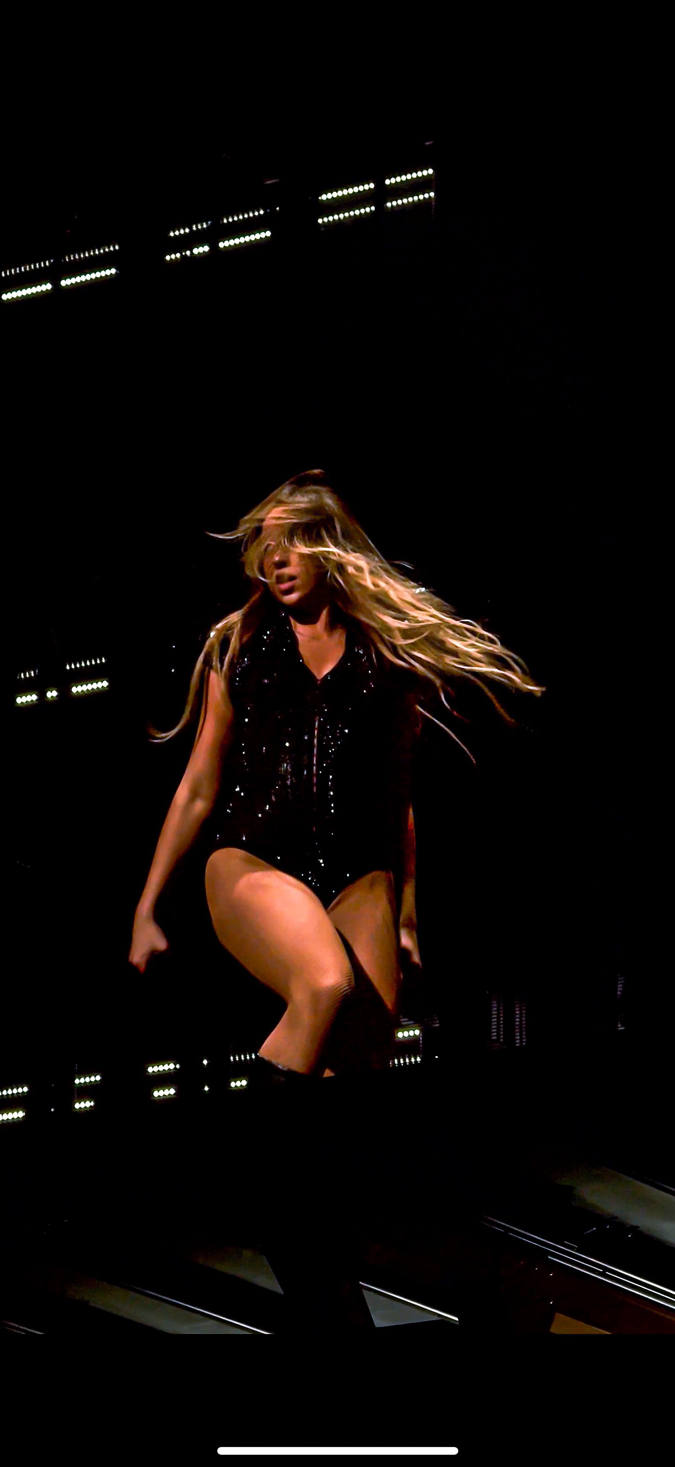 A female performer dancing on stage with long hair, wearing a black sequined outfit, against a dark background with bright stage lights.