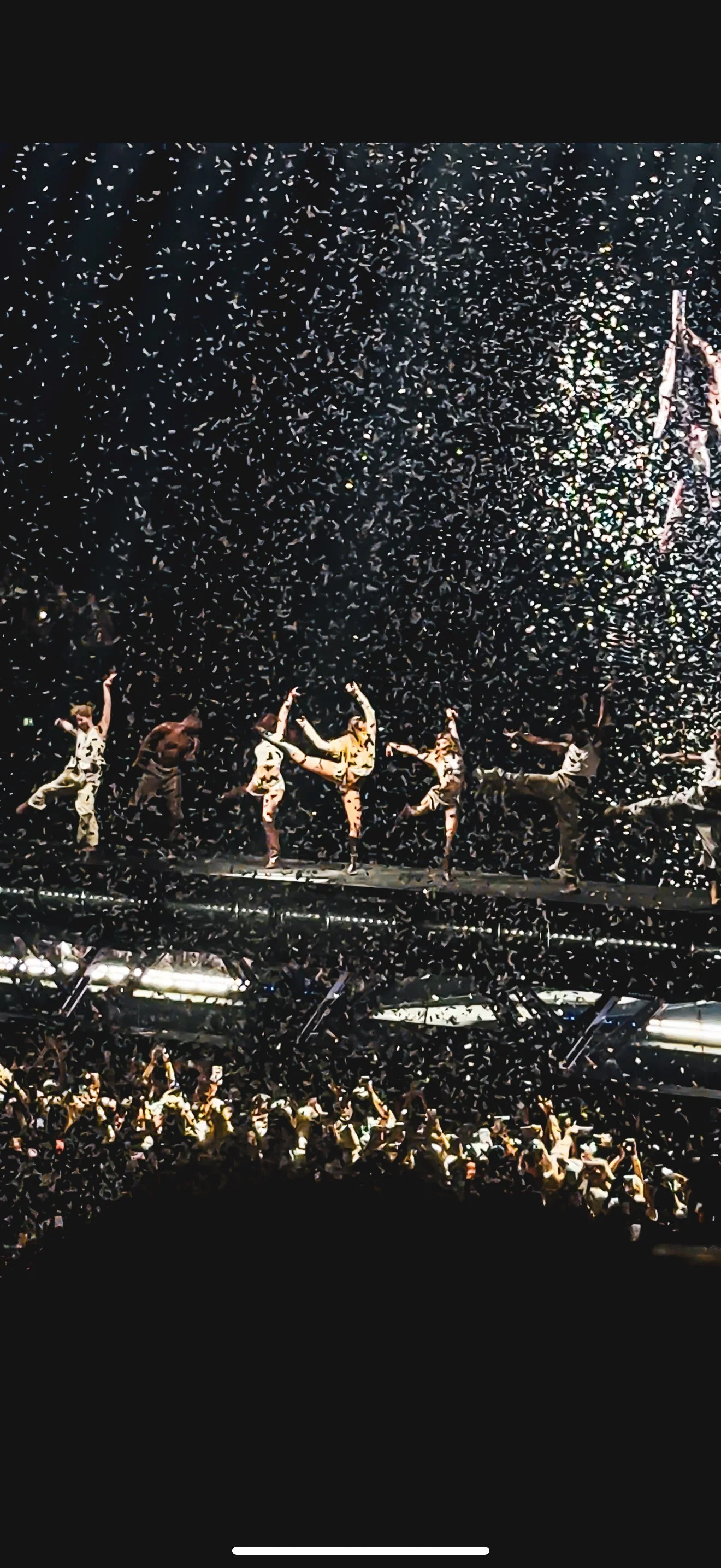 Dance performance on stage with a group of dancers in costumes, surrounded by falling confetti and an audience cheering.